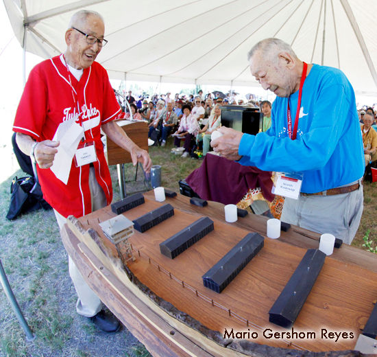 Jimi Yamaichi served as emcee during the outdoor portion of the 2016 Tule Lake Pilgrimage. At right is poet/playwright Hiroshi Kashiwagi. (Photo by MARIO GERSHOM REYES)
