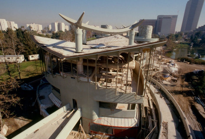 Other critics likened the pavilion’s shape, with its convex triangular walls and tusk-like exterior beams, to that of warrior helmets, dinosaurs, mastodons from the adjacent La Brea Tar Pits, ships, and giant shells.