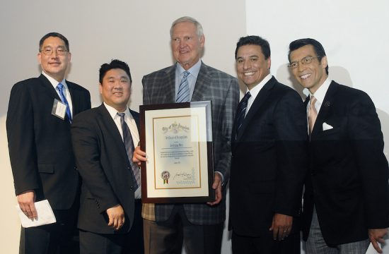 Dean spearheaded countless efforts to bring the Terasaki Budokan to fruition, including a 2013 event featuring NBA legend Jerry West (center). Also pictured are Alan Kosaka (far left), L.A. City Councilmember Jose Huizar and KABC news anchor David Ono, right.(MIKEY HIRANO CULROSS / Rafu Shimpo)